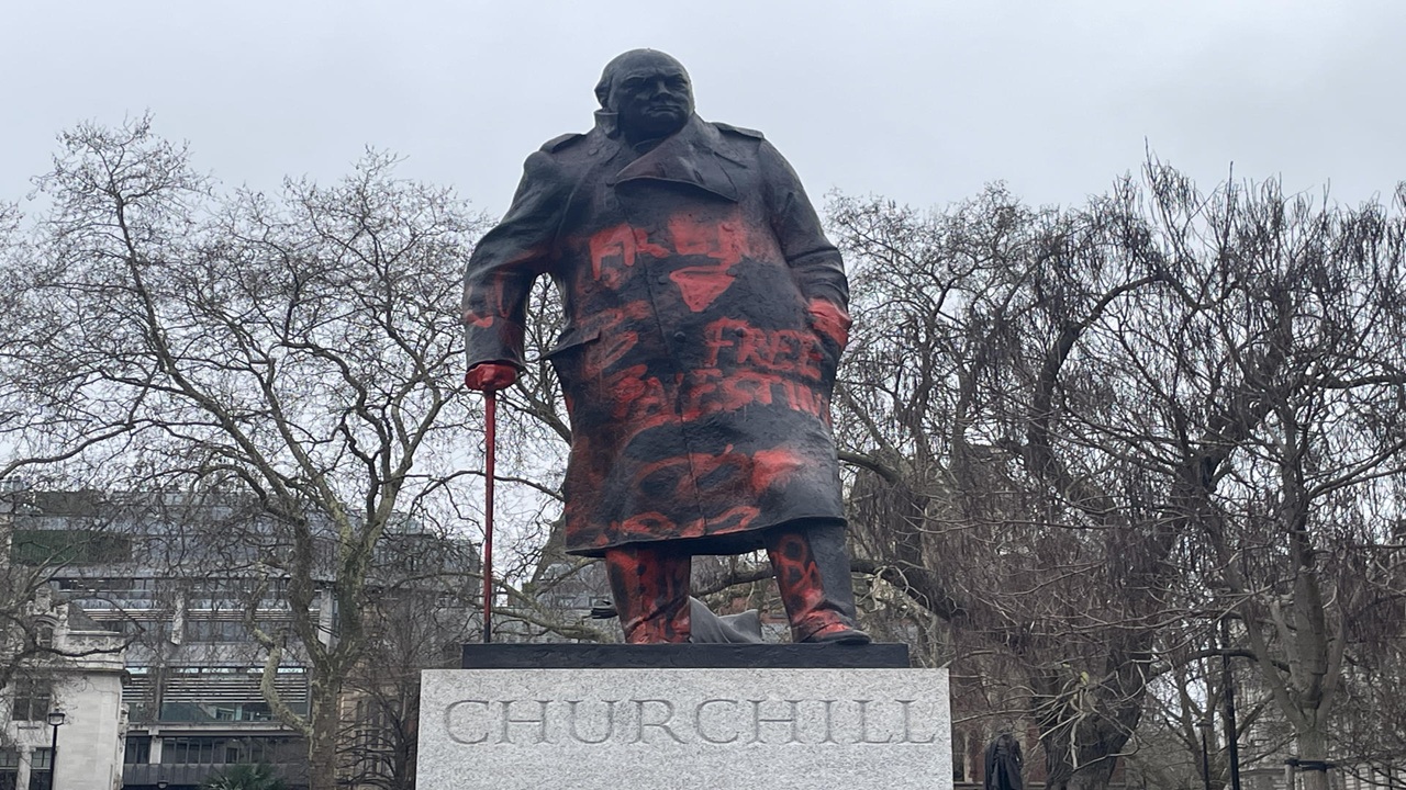 Ativista pró-Palestina foi preso nesta sexta na Inglaterra após pichar a estátua de Churchill localizada em Londres.