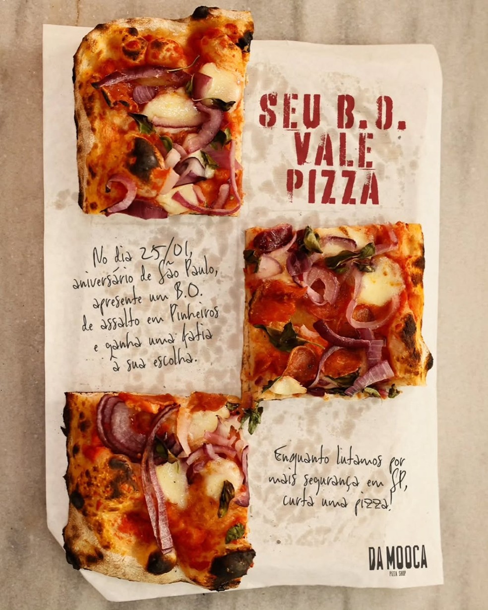 Campanha da pizzaria Da Mooca Pizza Shop vai ocorrer no dia do aniversário de São Paulo (25) e quer promover discussão sobre segurança pública em bairro com maior número de furtos de celulares na cidade.