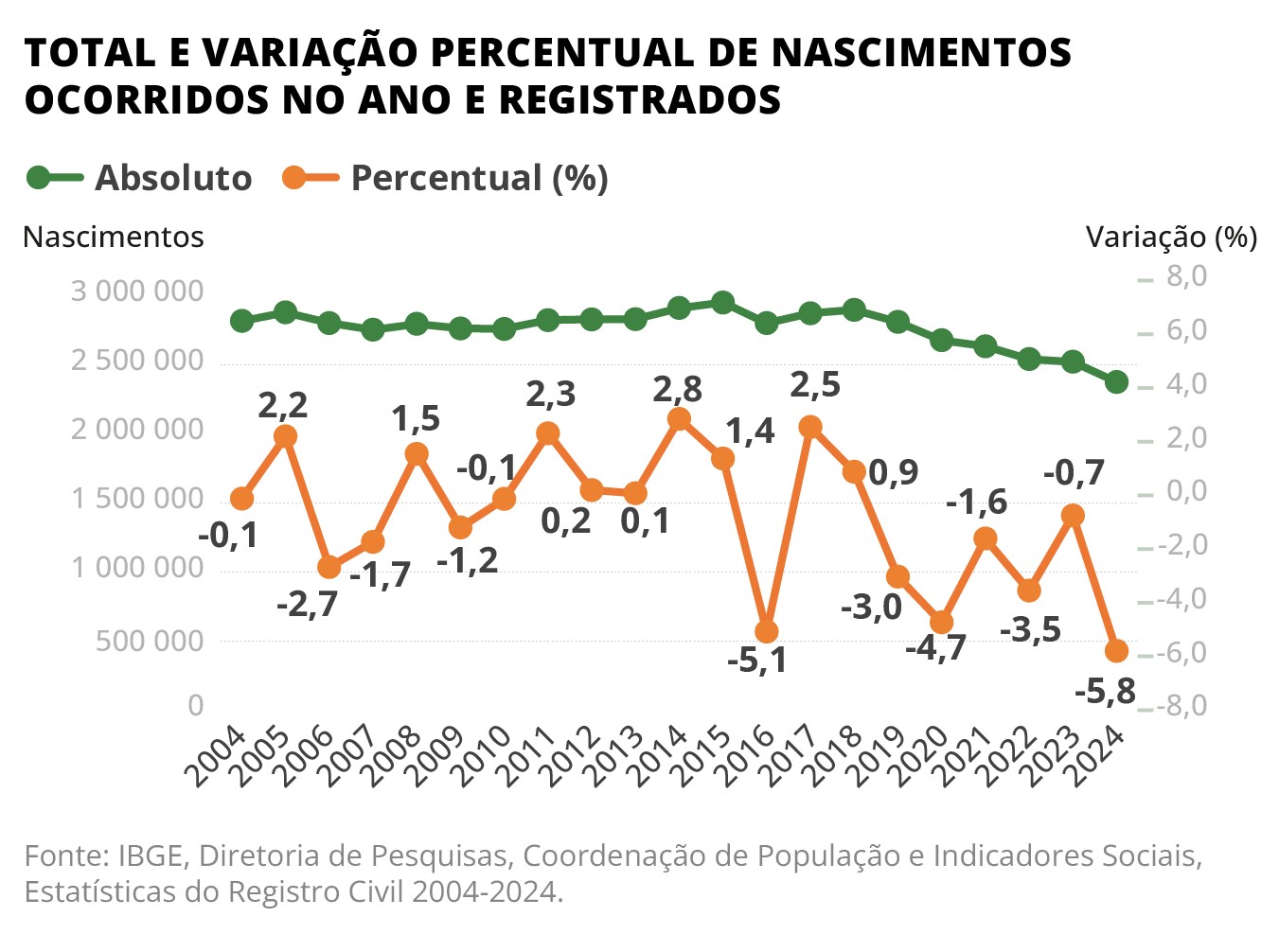 País registrou 5,8% menos nascimentos em 2024; queda acumulada supera 17% em relação ao período pré-pandemia, segundo Estatísticas do Registro Civil